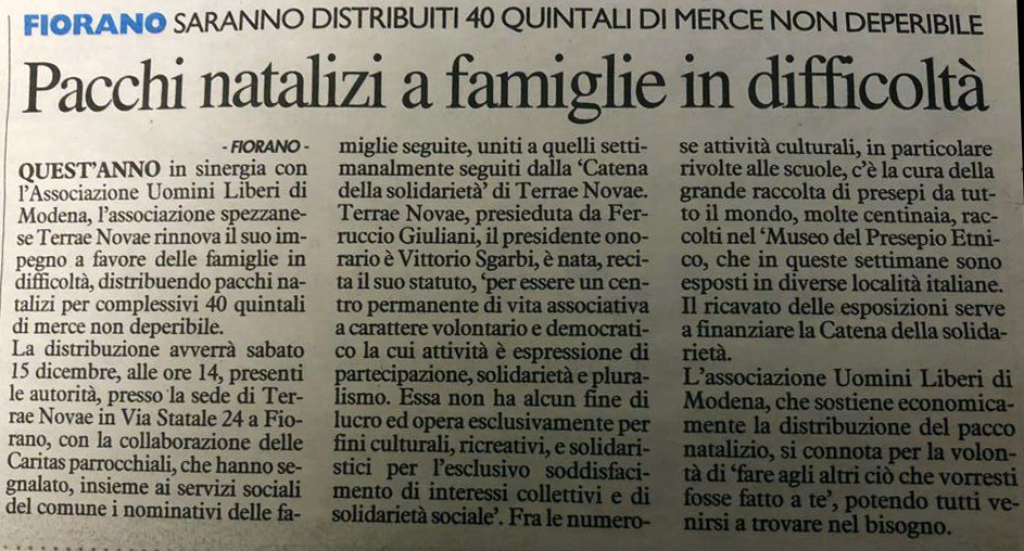 Come ogni anno, la Massoneria modenese si distingue per il grande impegno benefico nei confronti delle famiglie meno fortunate. Attraverso l’Associazione Terrae Novae, in comunione con l’Associazione Uomini Liberi di Modena, sabato 15 dicembre la Loggia Fratellanza e Progresso ha distribuito a Fiorano quaranta quintali di pacchi natalizi di merce non deperibile. La pregevolissima iniziativa ha raccolto l’interesse della stampa locale.
