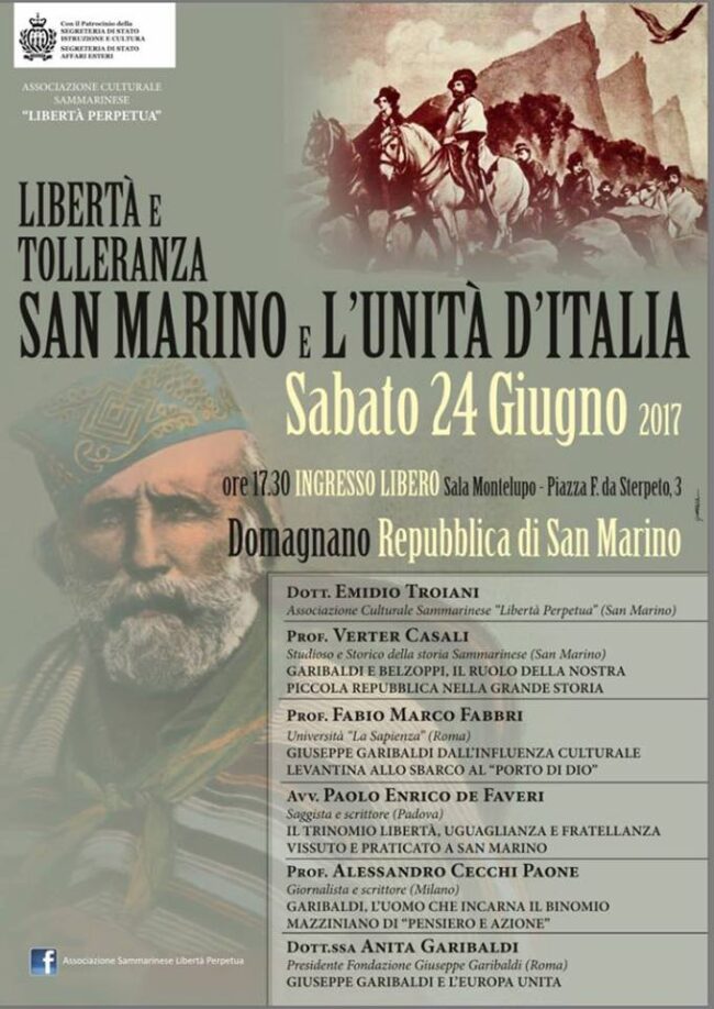 L’Associazione Libertà Perpetua di San Marino, organizza per sabato 24 giugno alle ore 17.30, un convegno dal titolo LIBERTÀ E TOLLERANZA. SAN MARINO E L’UNITÀ D’ITALIA Aprirà i lavori il Dott. Emidio Troiani, presidente dell’Associazione, seguiranno gli interventi di: Prof. Fabio Marco Fabbri – Università La Sapienza di Roma Avv. Paolo Enrico De Faveri  –…